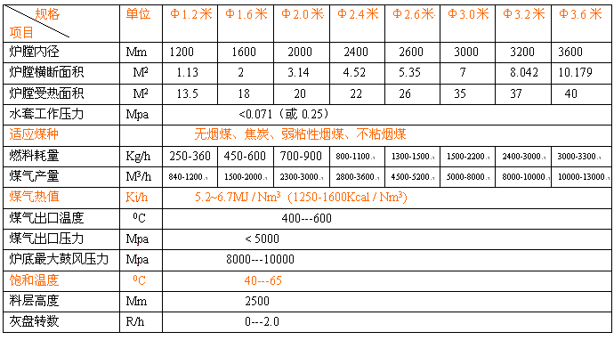 單段式煤氣發生爐技術參數